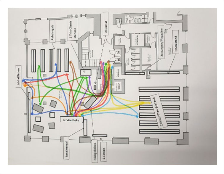 Das Behavioural Mapping (PDF) ist eine Erweiterung der reinen Beobachtung. Es konzentriert sich auf die Laufwege der Nutzerinnen und Nutzer und eignet sich gut zum Einstieg in die UX-Methoden. Sie benötigen lediglich einen Grundriss oder selbst skizzierten Plan des Raums oder der Bibliotheksetage, die Sie untersuchen möchten, sowie Stifte. Dann setzen Sie sich für eine bestimmte Zeit in diesen Raum und beobachten die Nutzerinnen und Nutzer.