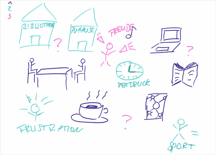 Das Cognitive Mapping (PDF) ist eine anspruchsvollere Methode, besonders in Bezug auf Ihre Überredungskunst. Bei dieser Methode dürfen die Nutzerinnen und Nutzer zeichnen! Und bei dem Begriff „Zeichnen“ wird die Anzahl der Freiwilligen plötzlich überschaubar. Die Nutzerinnen und Nutzer zeichnen 6 Minuten lang eine grobe Skizze zu einer bestimmten Fragestellung, beispielsweise „Wie sieht Ihr idealer Lernort aus?“.